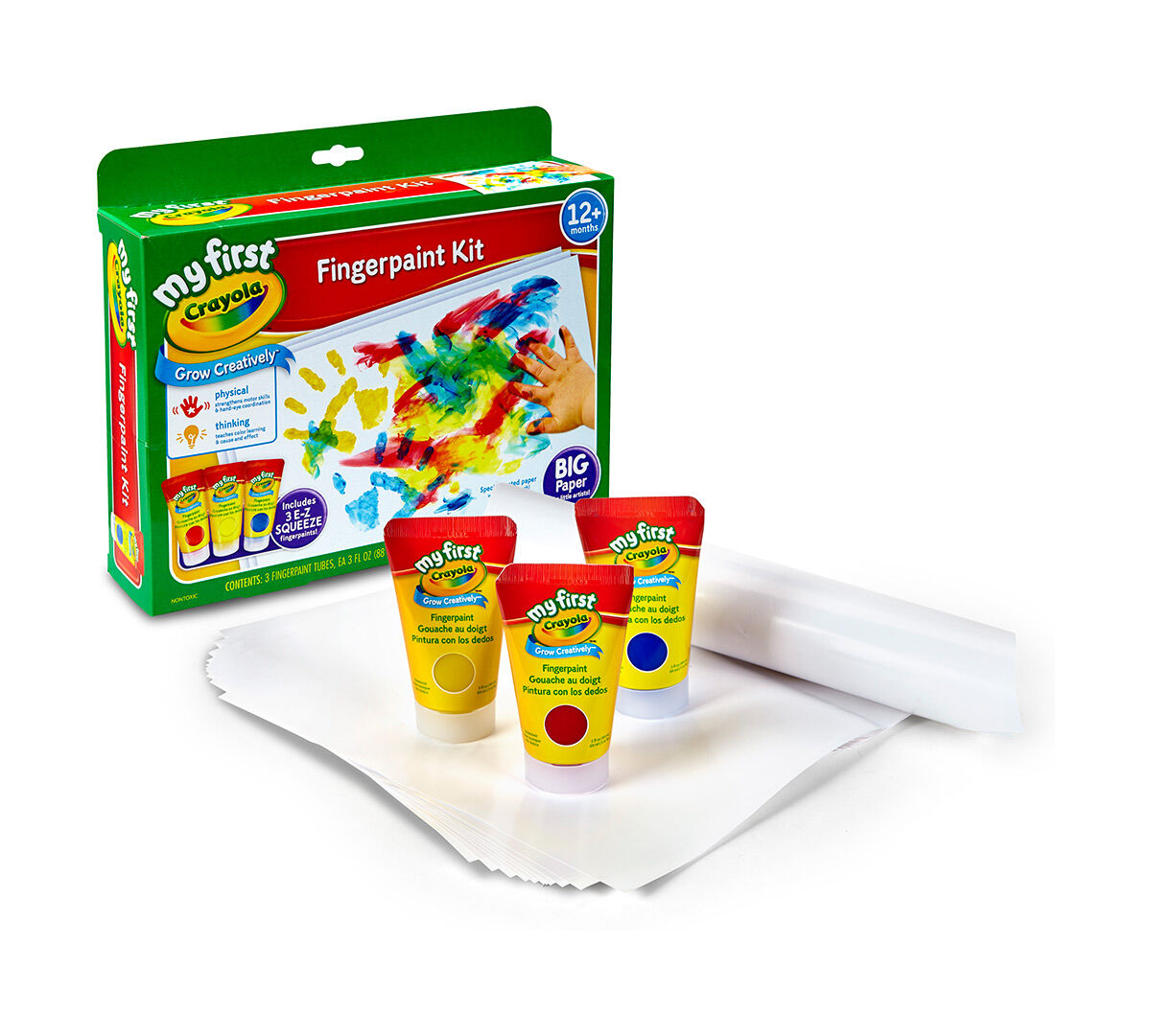 With My First Crayola Fingerpaint Kit the only thing kids need to start creating and learning are their own hands. Roll Over Image to Zoom. Three 3-ounce easy-squeeze tubes of fingerpaint and 10 sheets of paper provide hours of tactile experimenting color mixing and artistic fun.